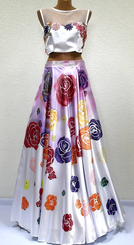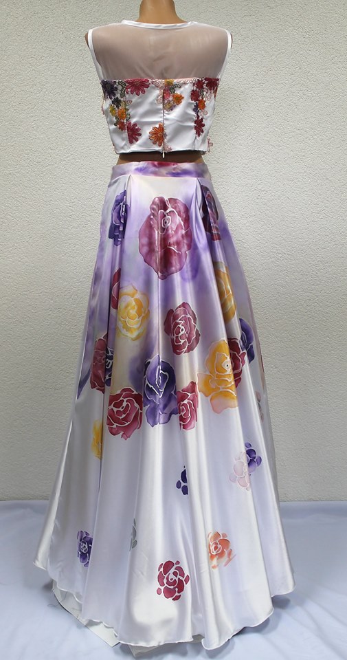 Veličina 38 EU Ručno oslikan dvodjel, gornji dio je aplicirana čipka koja je predhodno bojana sa bojama za svilu, donji dio je rađen na saten svili.